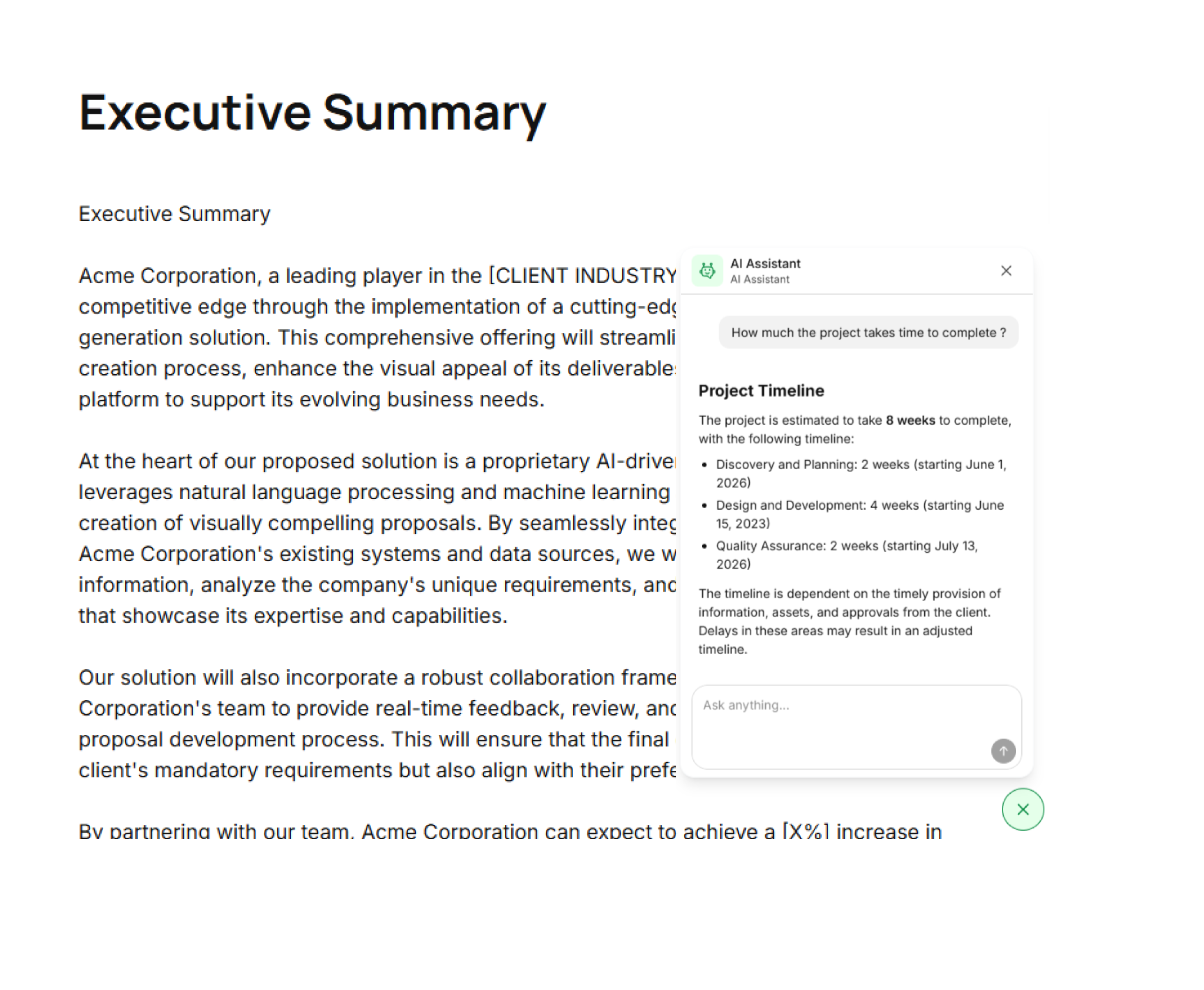Let AI generate stunning, professional proposals tailored to each client. Customize with your branding, add payment options, and send for approval instantly.