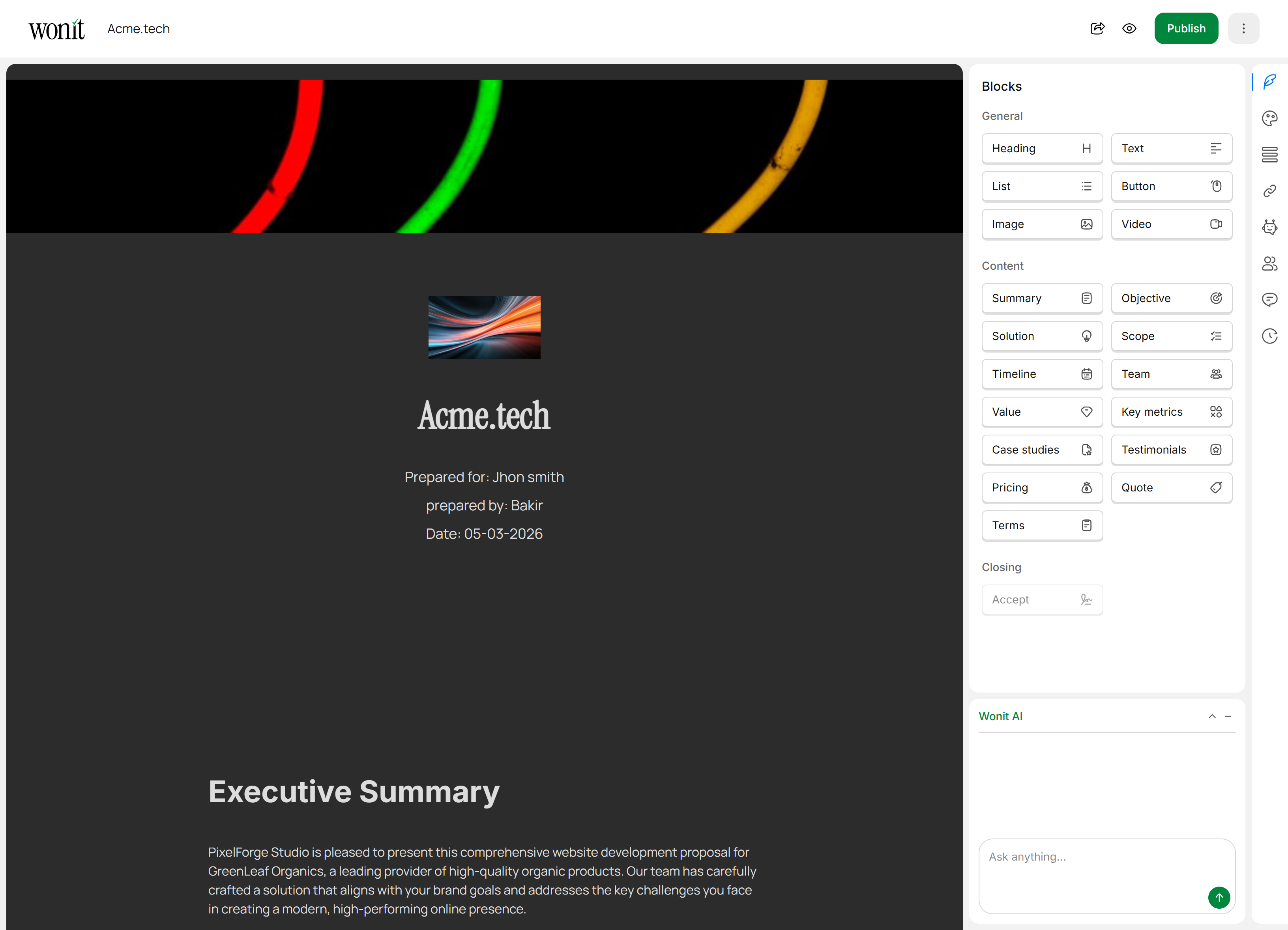 Generate high-converting proposals quickly with tailored messaging, structured sections, and branded presentation.